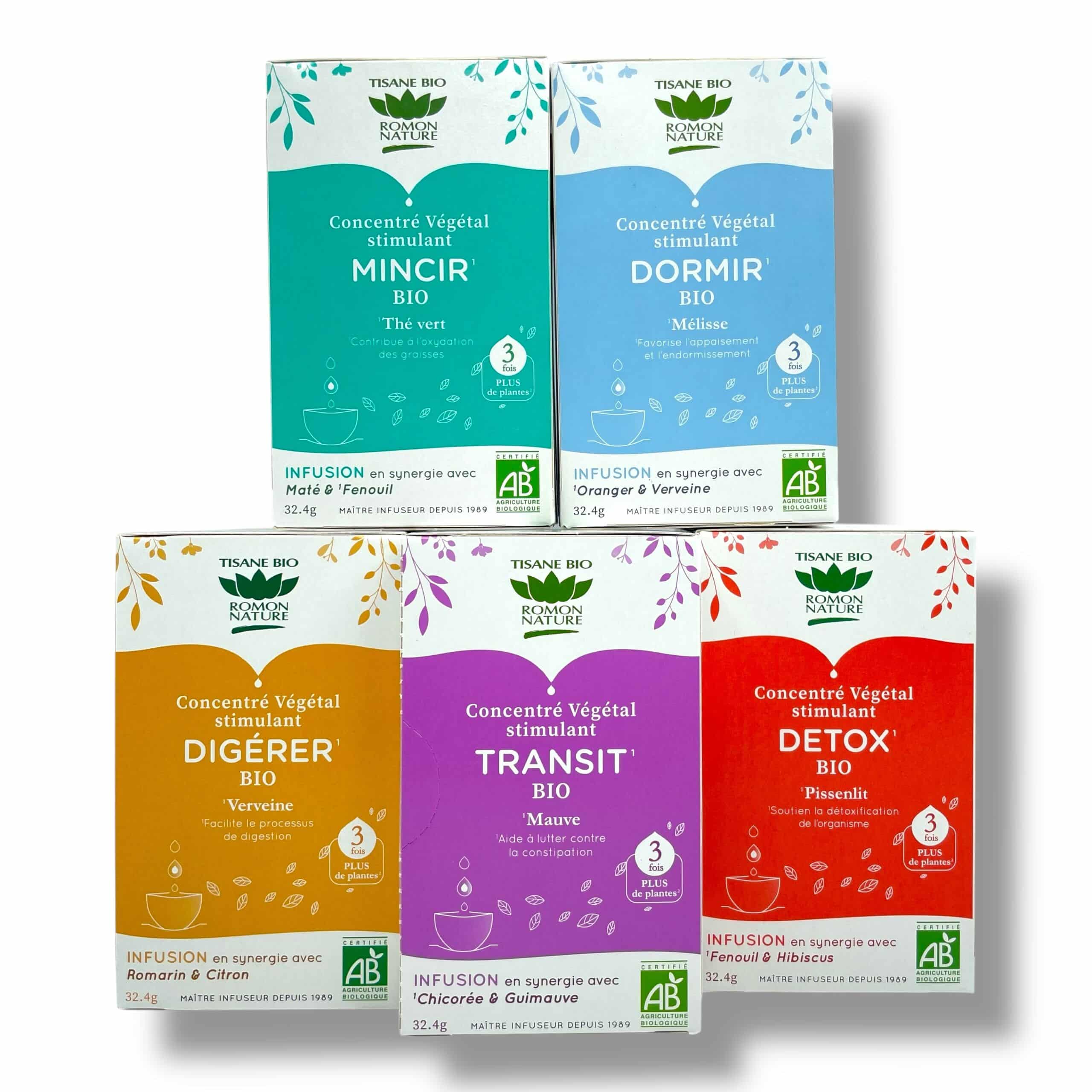Romon Nature a développé cinq tisanes bio "triple concentrations" Bio - Chaque boite contient 18 sachets.